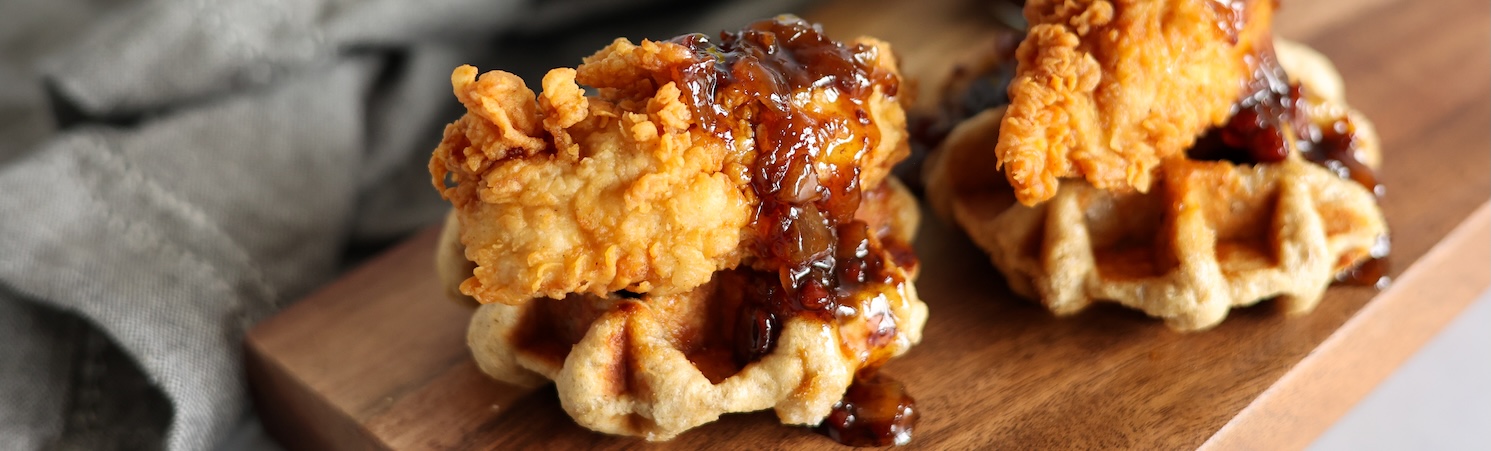 Southern Style Chicken & Waffles with Bacon Onion Maple Syrup