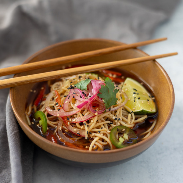 Spoon noodles in bowl, top with broth and garnish with red onion, cilantro and sesame seeds
